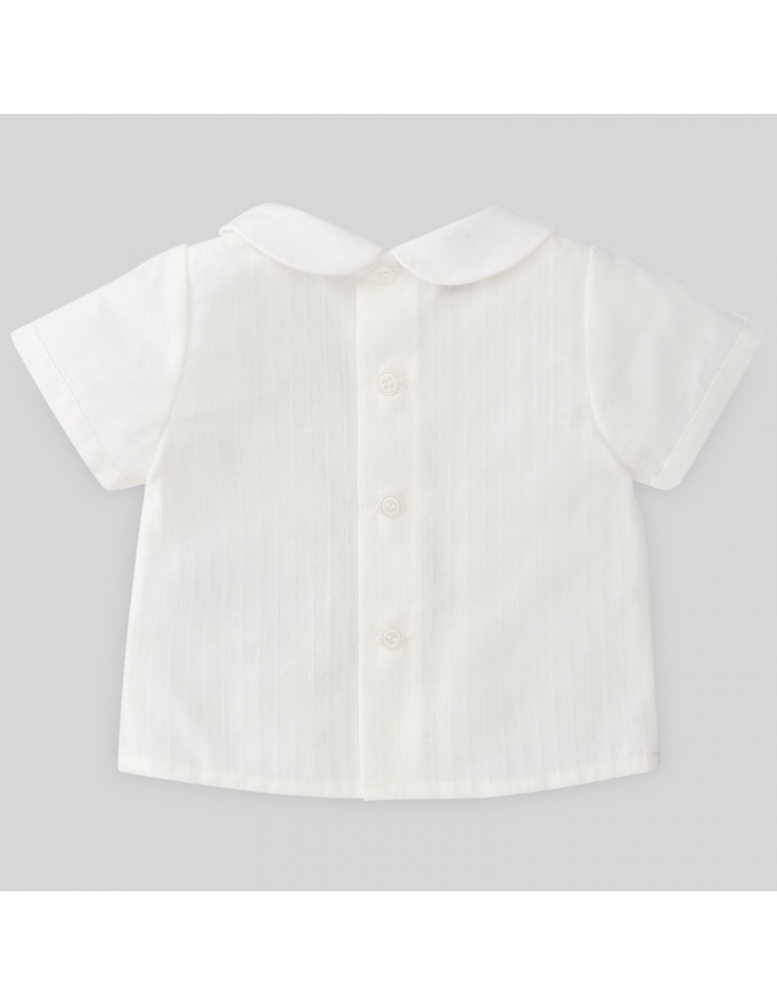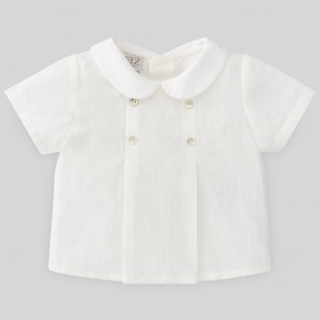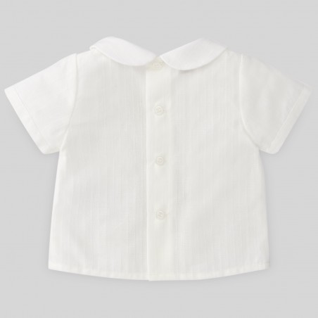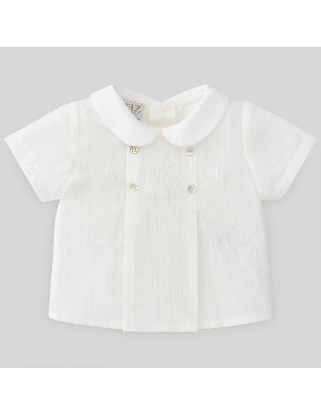 Blusa manga corta con cuello redondo, detalle en el pechero con botones de adorno. Cierre en espalda con botones al tono.