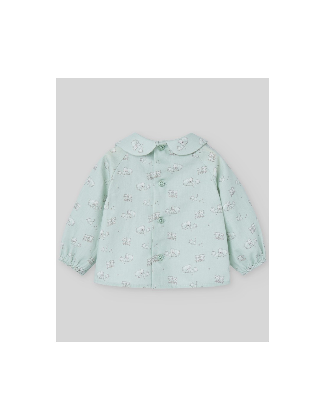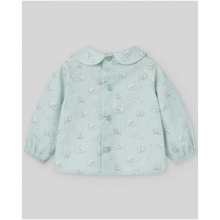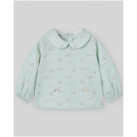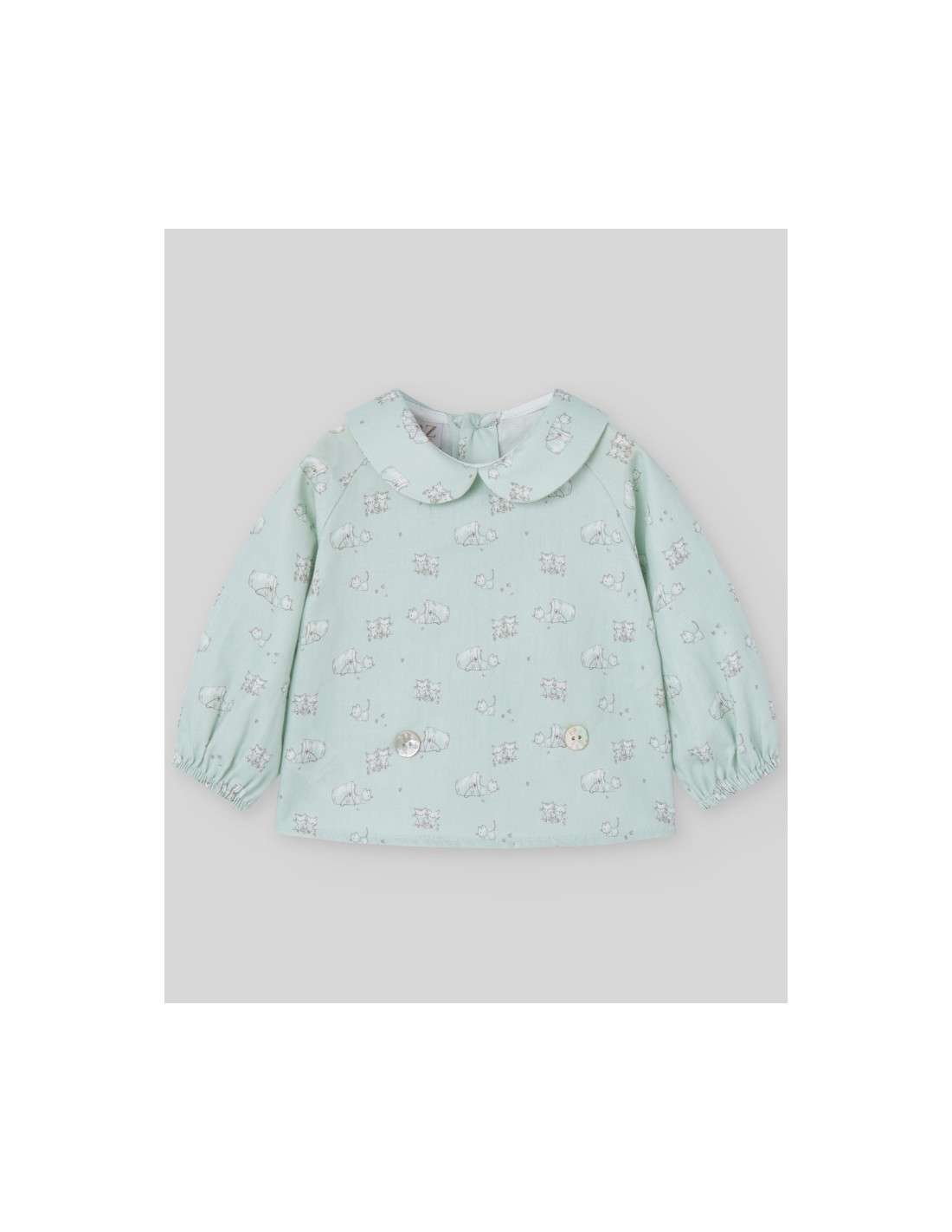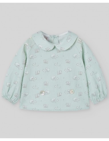 Blusa de tela estampada con gatitos de la colección MININO de Paz Rodríguez. Cuello redondo, manga larga y puños con elástico. Cierre trasero con botones.