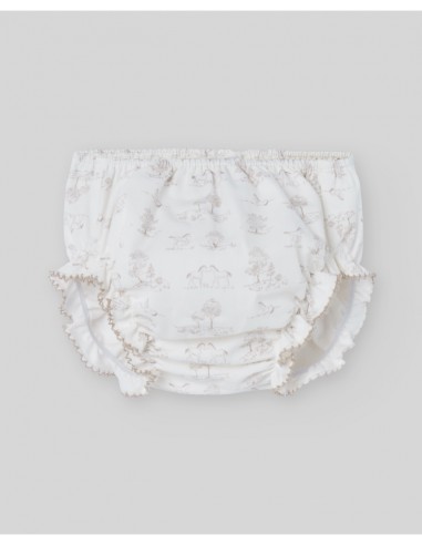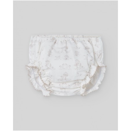 Braga de tela estampada con caballitos y arbolitos, con corte abombado que aporta movimiento y dulzura. Diseñada para completar conjuntos de temporada con un toque especial.