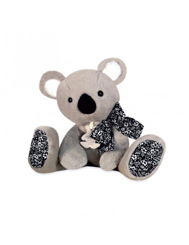 Koala de peluche muy suave de 25cm en color gris, con lacito en el cuello y plantas de las patas en estampado de flores negras.