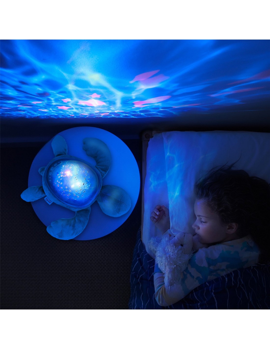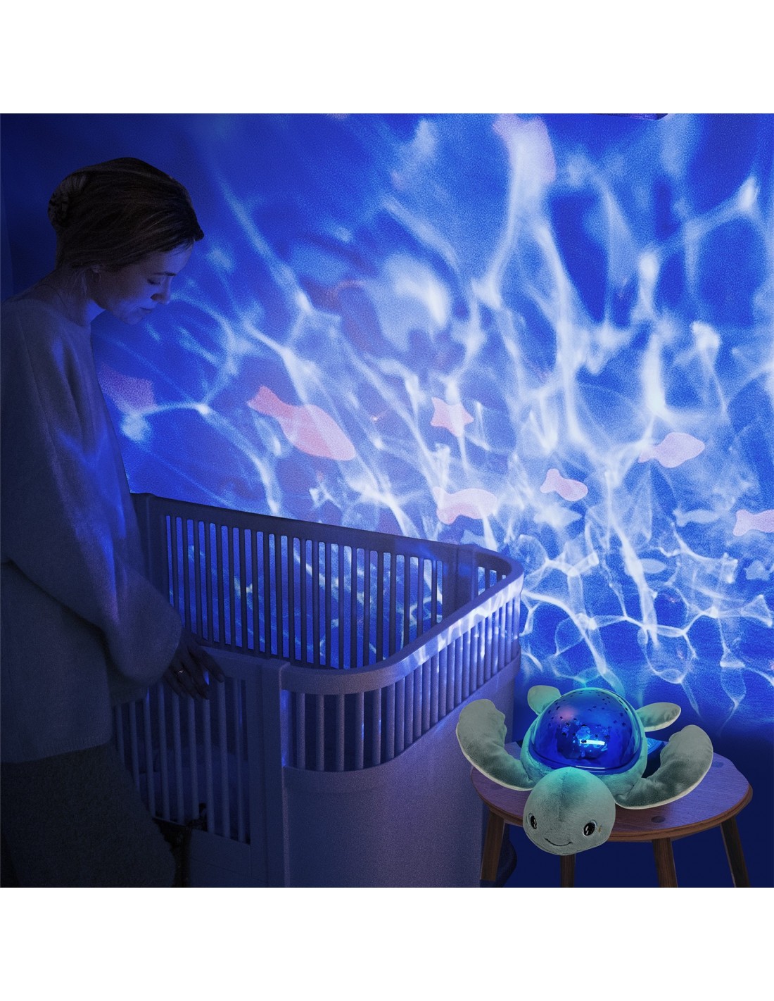 Proyecta imágenes submarinas animadas con peces en movimiento. Incluye sonidos como canción de cuna musical, melodía del mar o ruido blanco (lluvia, olas y latidos del corazón). Volumen ajustable.