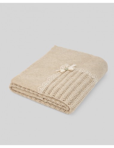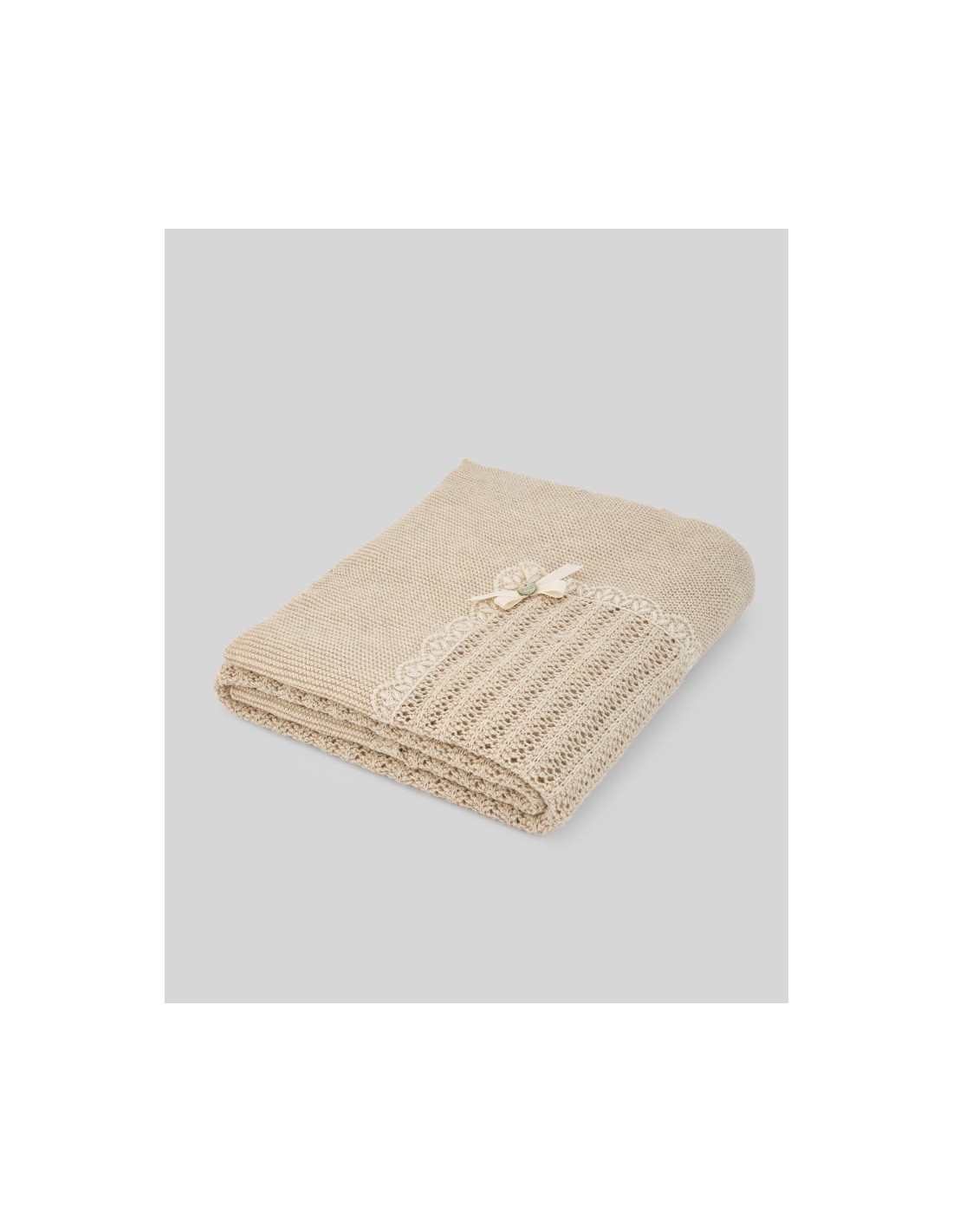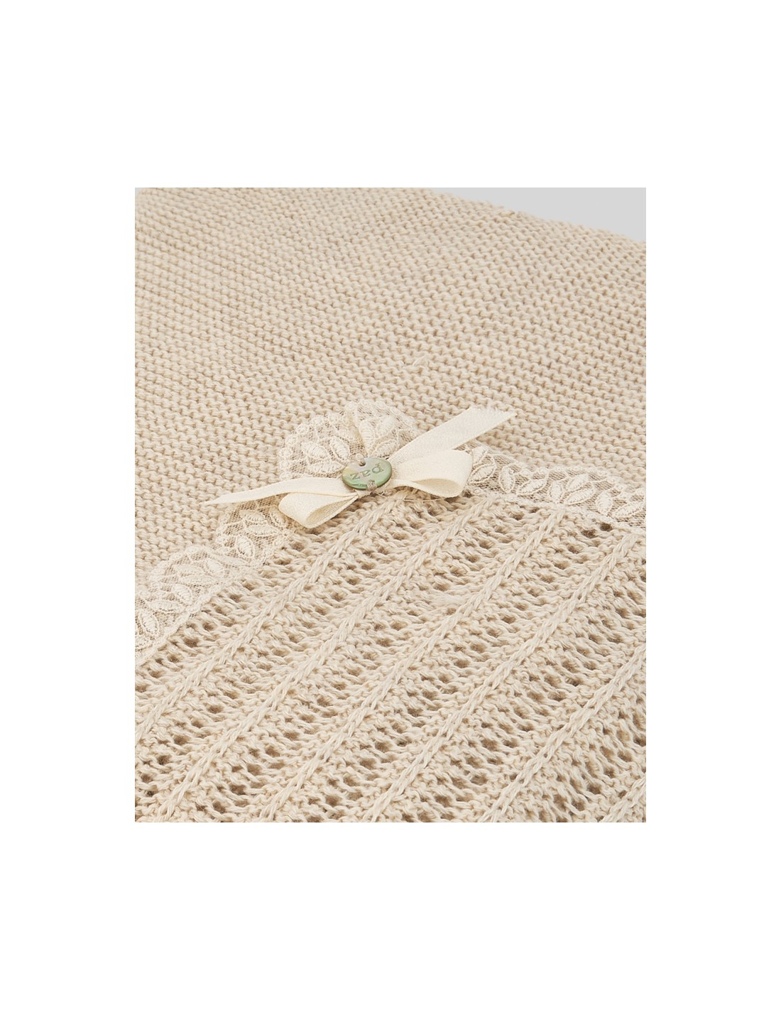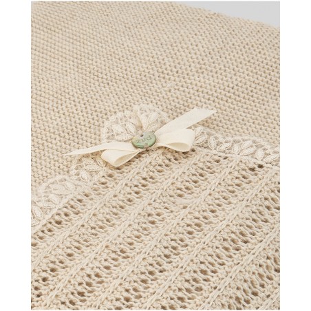 Toquilla de punto con centro calado y puntilla y borde de punto bobo, acompañada de lazo decorativo. Colección Alegría de Paz Rodríguez.