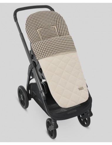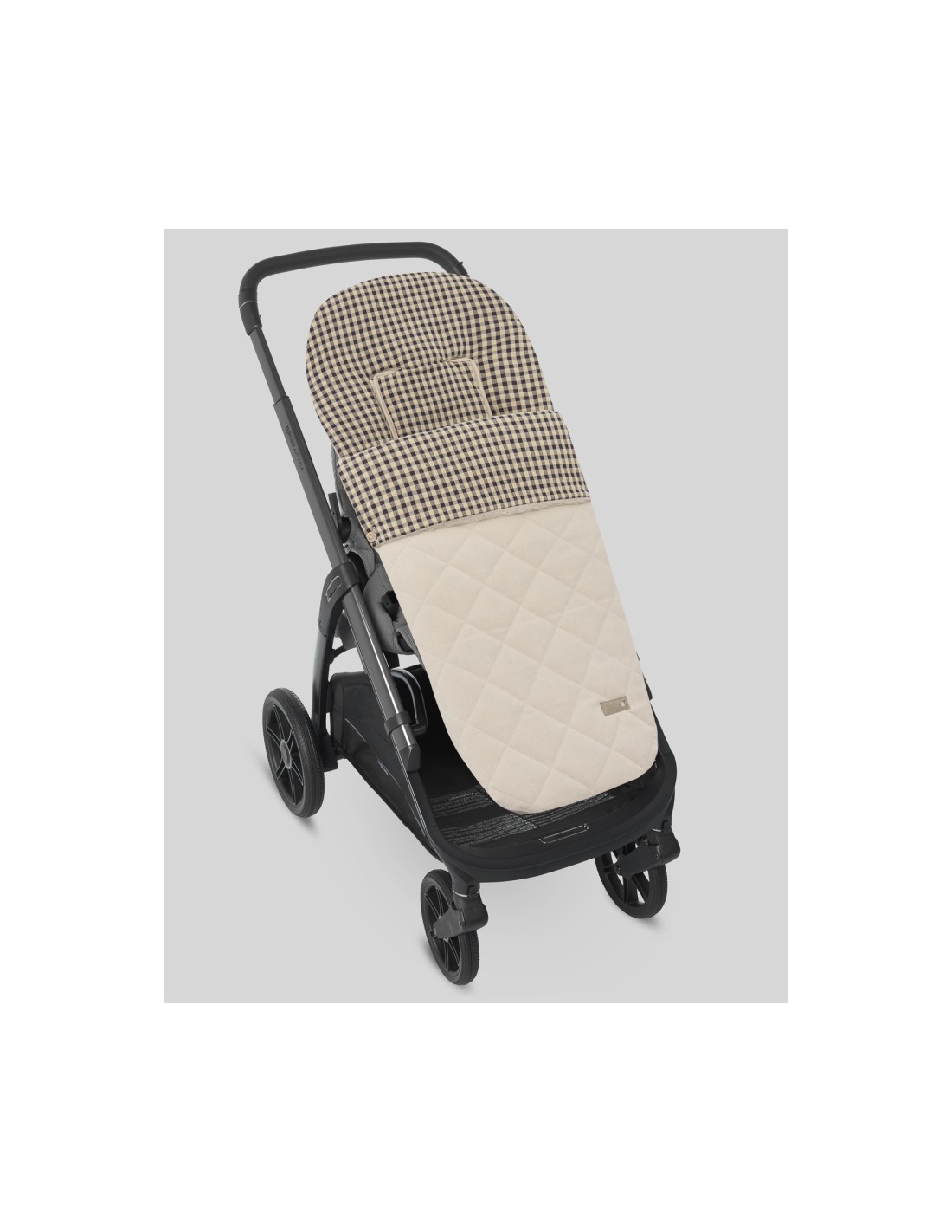 Saco universal para sillas de bebé confeccionado en pana acolchada "waterproof" combinada con tejido interior cuadrito vichy. Embozo reversible con pelo. Cremalleras laterales para convertir el saco en colchoneta. Relleno extraíble. Colección Wind de Paz Rodríguez