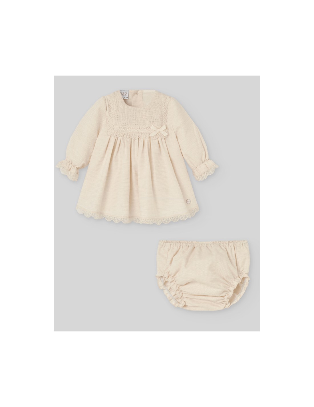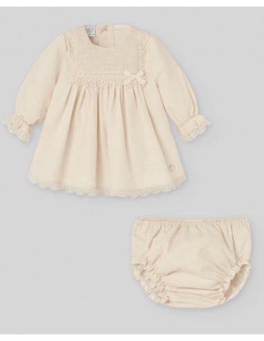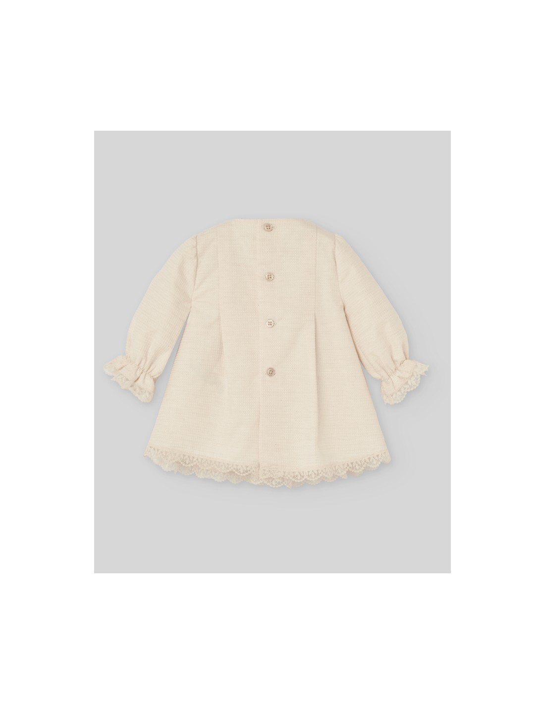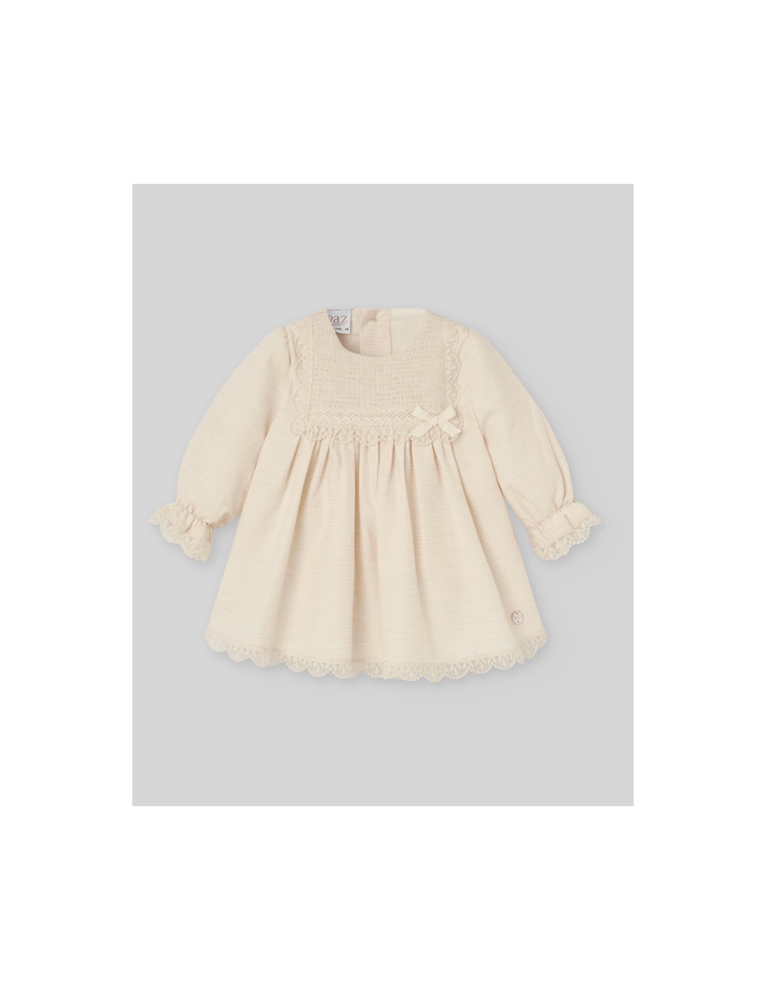 Conjunto de Vestido y braga de ceremonia en tela jacquard en manga larga, con nido de abeja en canesú y puntilla. Colección Alegría de Paz Rodríguez.