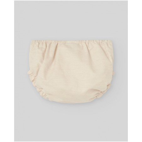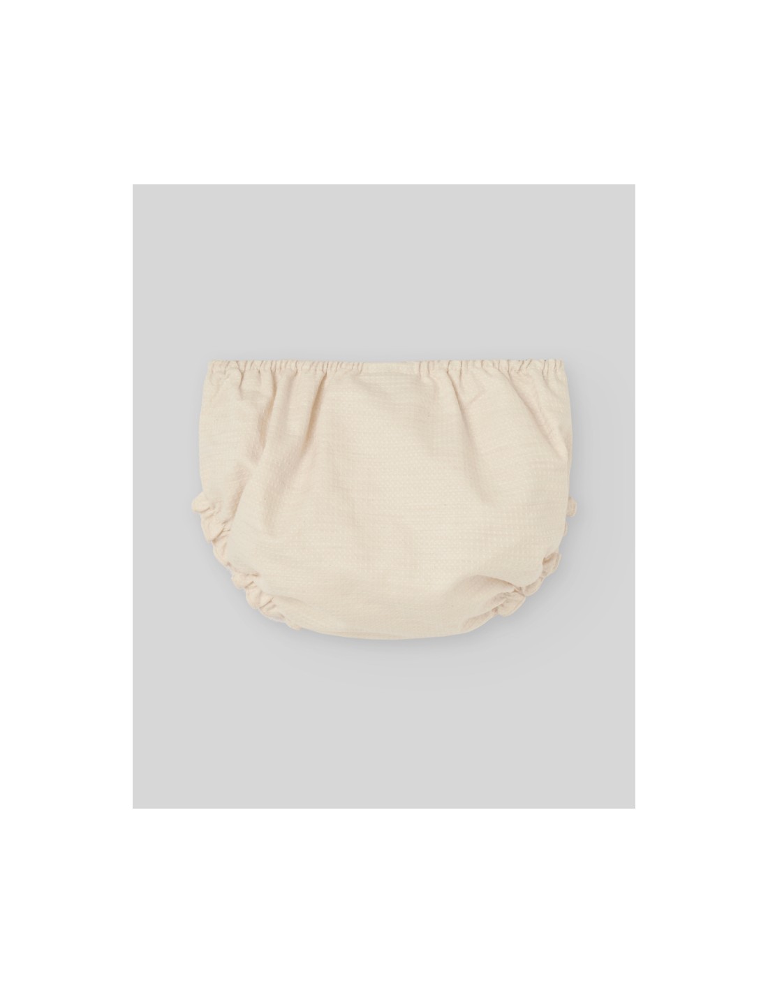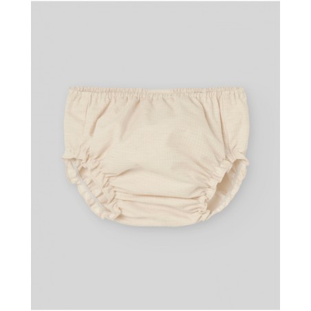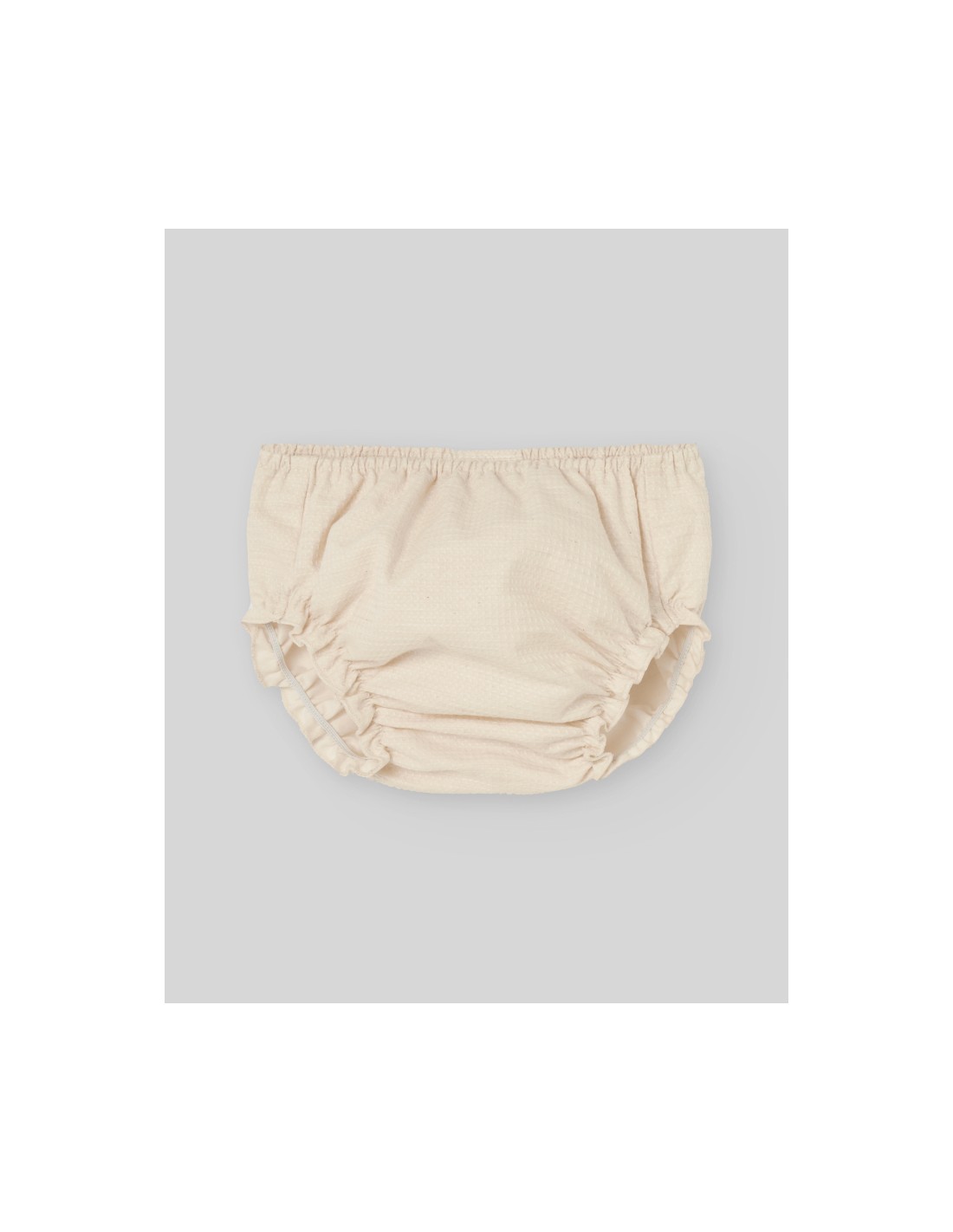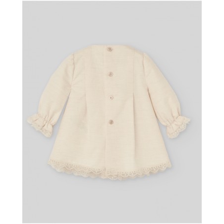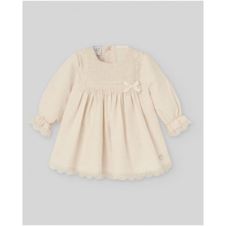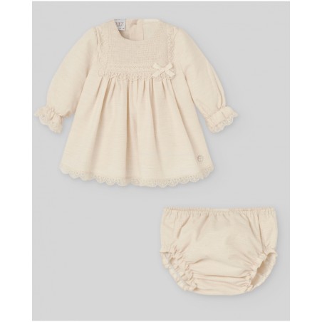 Conjunto de Vestido y braga de ceremonia en tela jacquard en manga larga, con nido de abeja en canesú y puntilla. Colección Alegría de Paz Rodríguez.