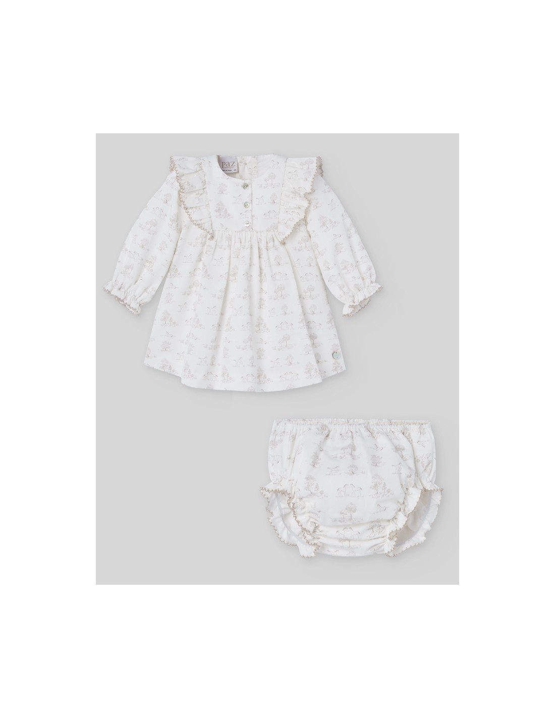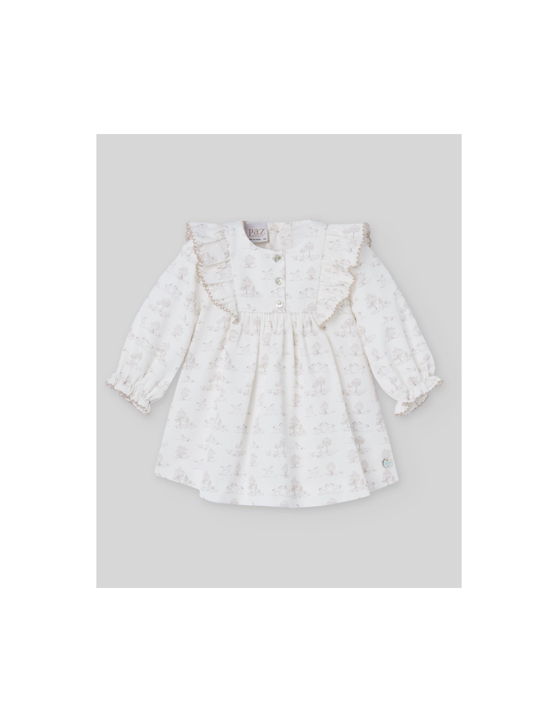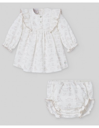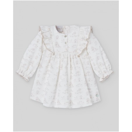 Vestido con braga de tela estampado con caballitos y arboles con cuello redondo. Manga larga con volante en el puño y cierre trasero con botones. Corte con vuelo. Colección Pony de Paz Rodríguez.