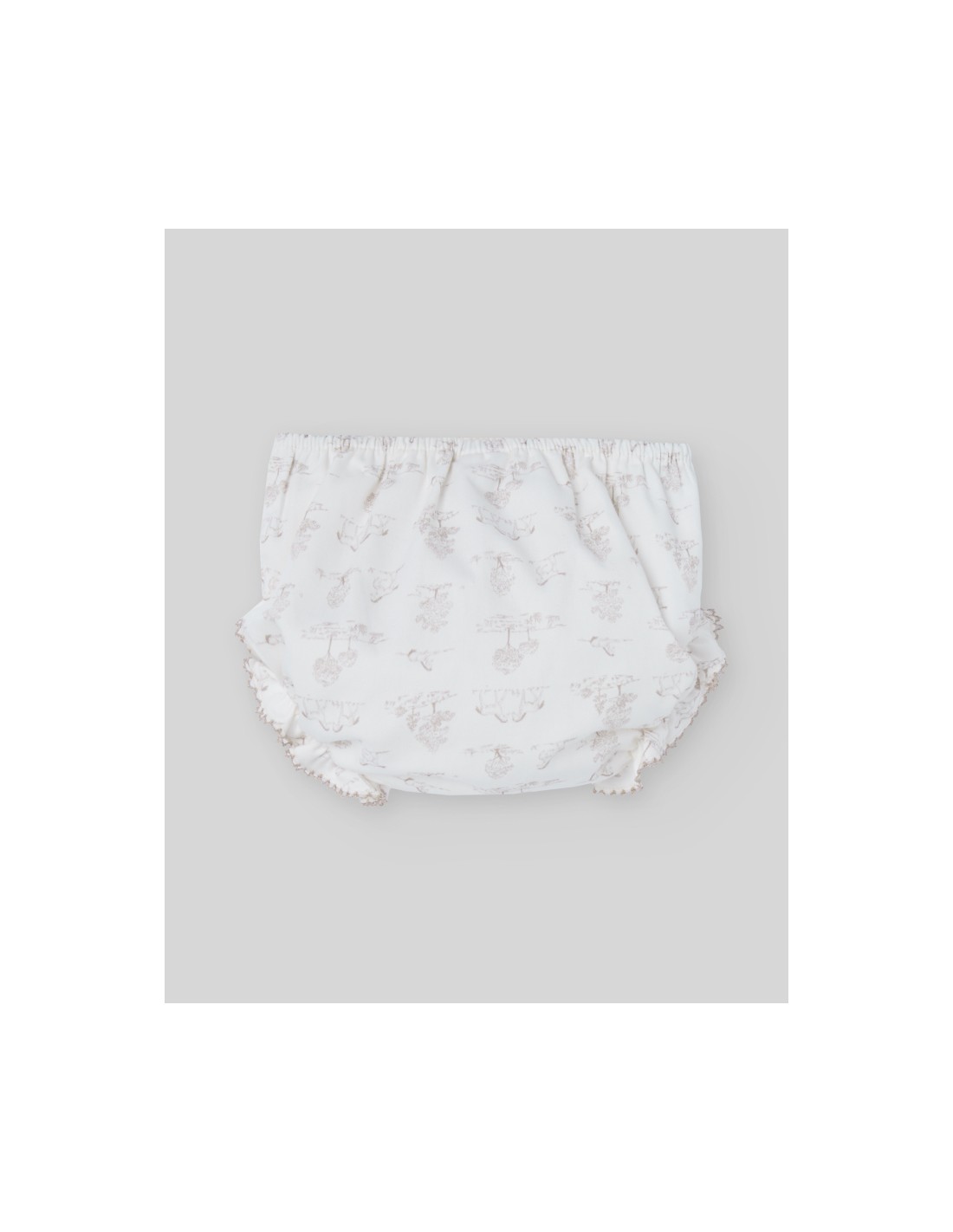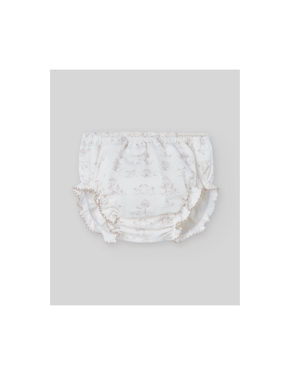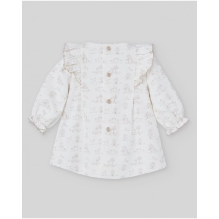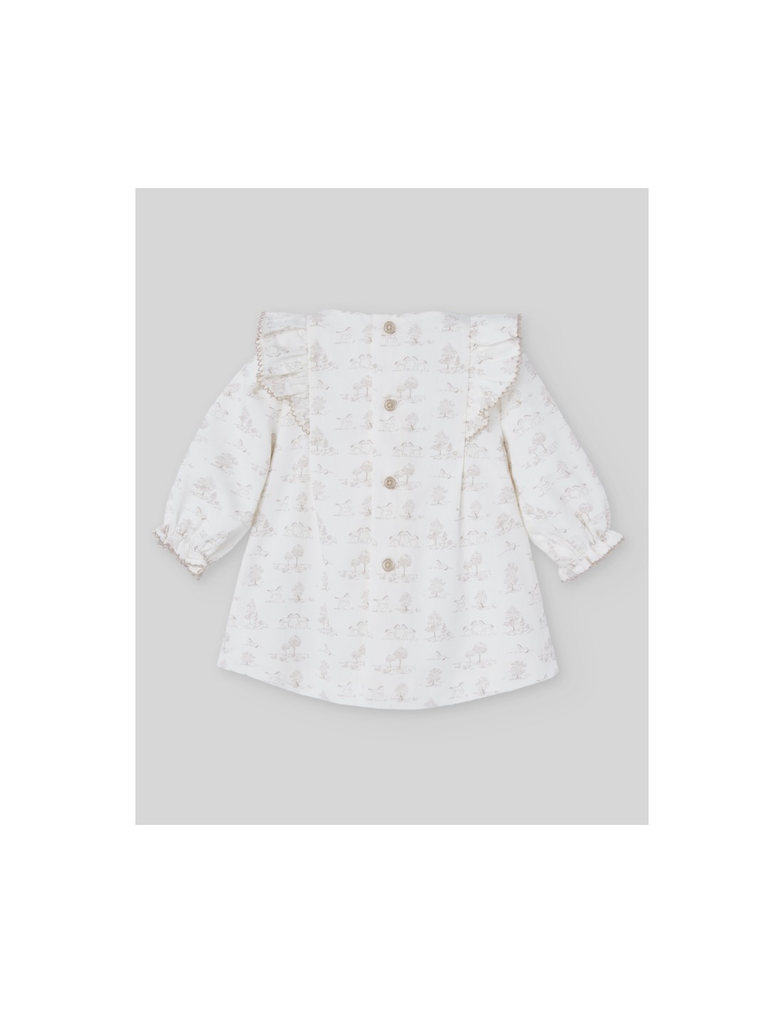 Vestido con braga de tela estampado con caballitos y arboles con cuello redondo. Manga larga con volante en el puño y cierre trasero con botones. Corte con vuelo. Colección Pony de Paz Rodríguez.