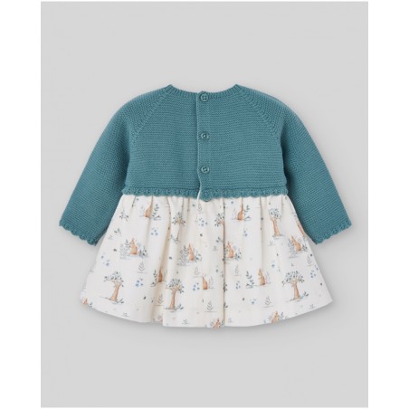 Conjunto de vestido puntotela de manga larga con cuerpo de punto bobo y falda de tela estampada con motivos de bosque y braga de punto. Su diseño combina calidez y fantasía para ocasiones especiales o looks diarios con encanto. Colección Pompon de Paz rodríguez.